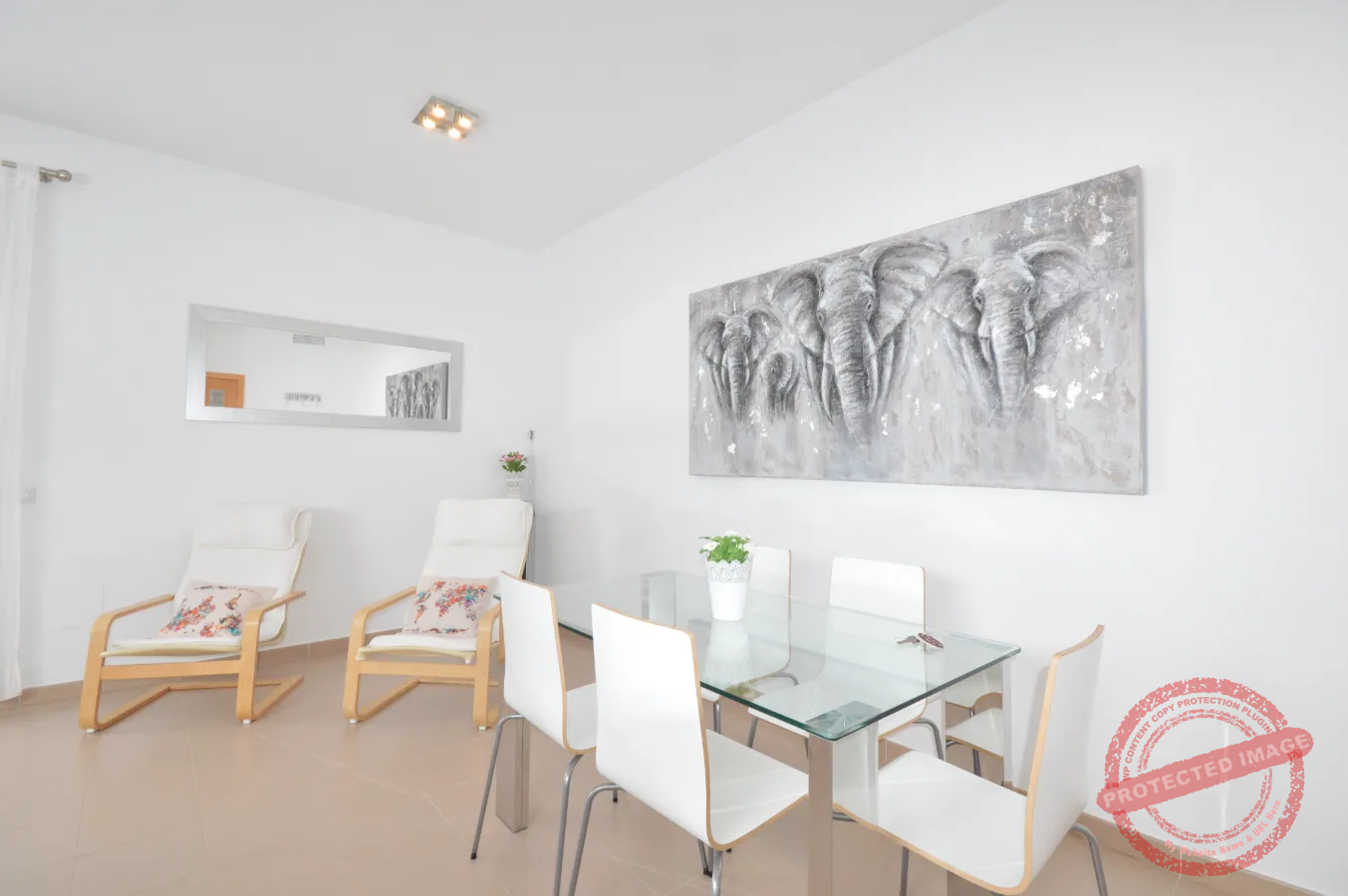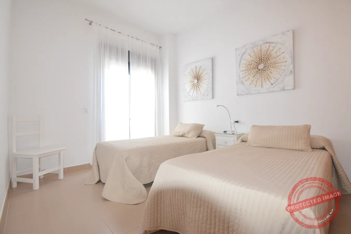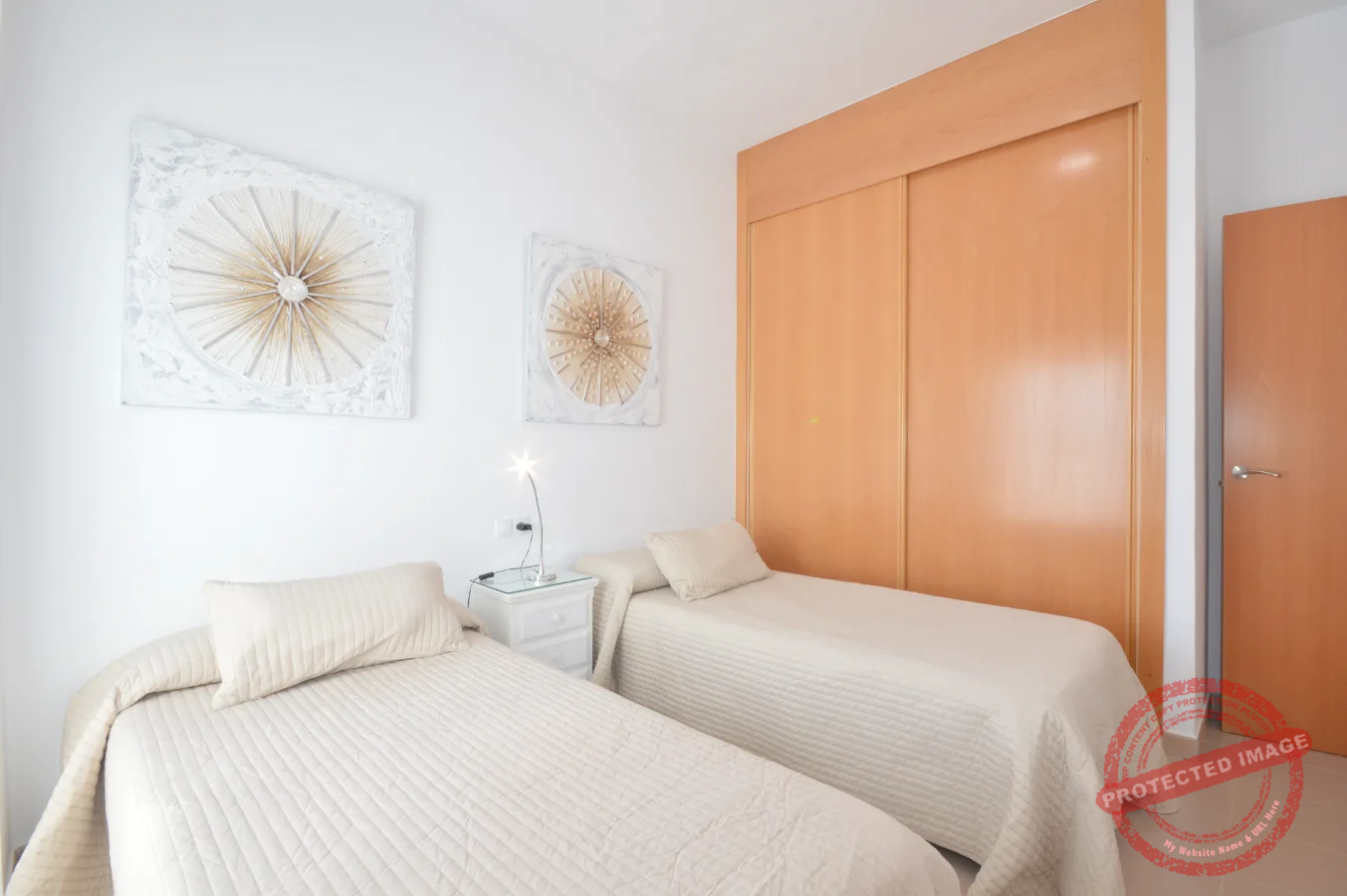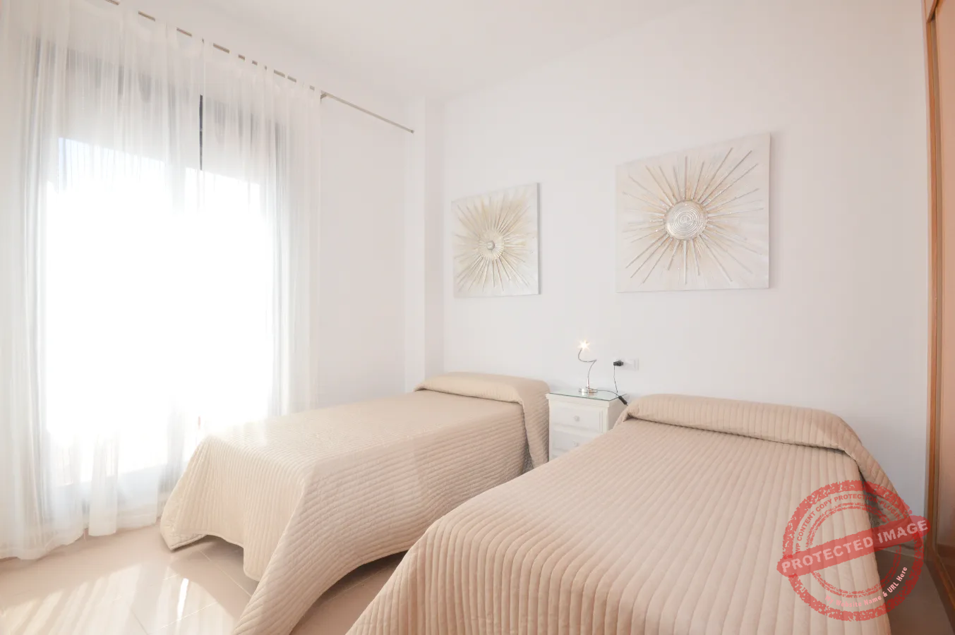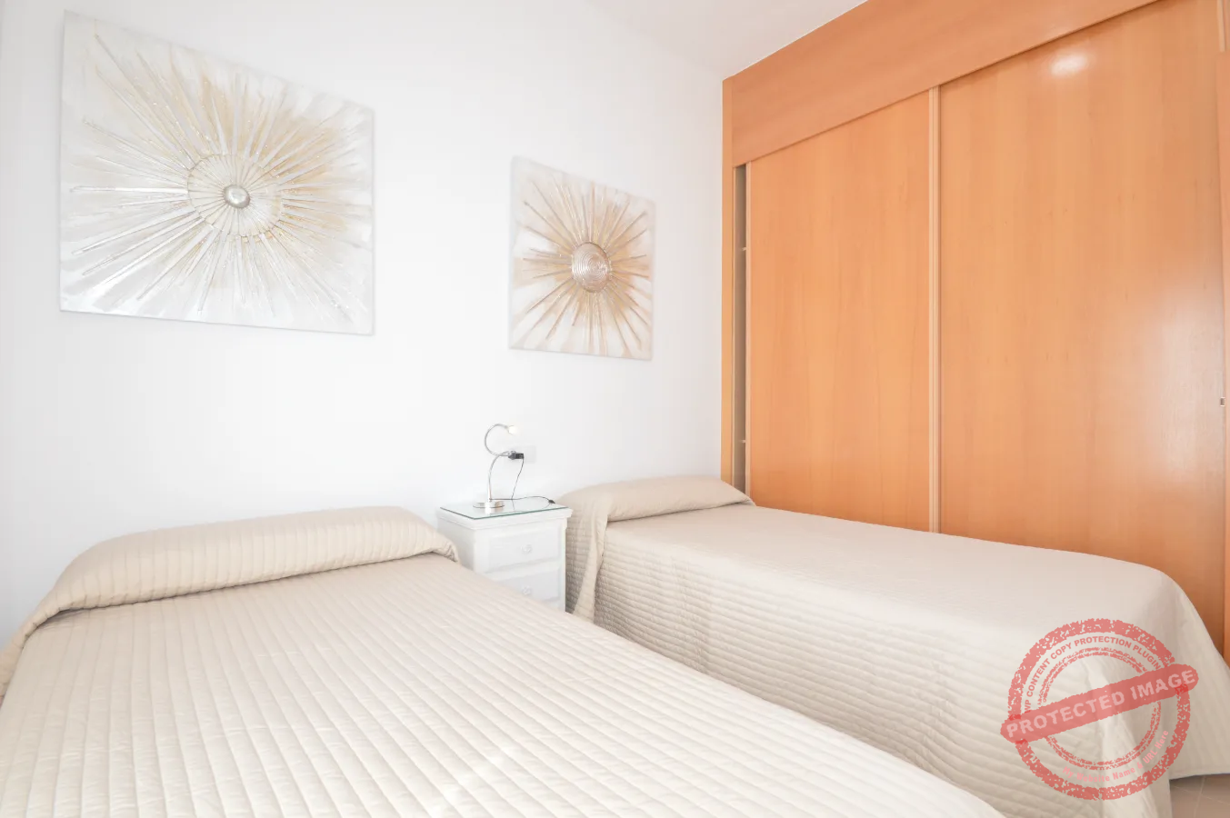 El apartamento dispone de tres dormitorios y dos cuartos de baño, ofreciendo capacidad para hasta seis personas, incluyendo niños y bebés. De manera excepcional, podría alojarse una séptima persona únicamente si se trata de un niño o bebé. Uno de los dormitorios cuenta con cama de 150 cm, y los otros dos están equipados con dos camas individuales de 90 cm cada uno.