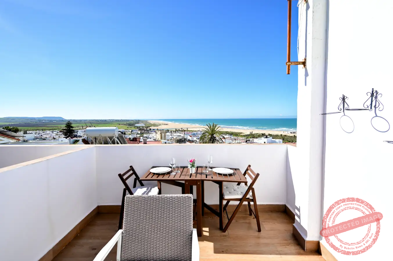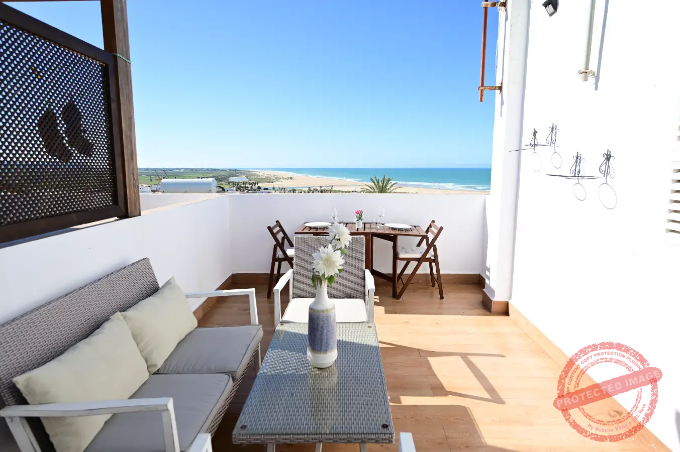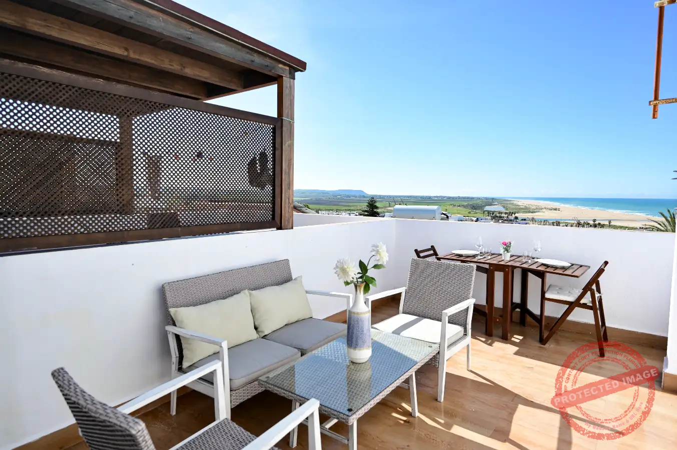 En la parte superior se encuentra una terraza independiente, con mesas y sillas, ideal para comer al aire libre y desde donde se pueden disfrutar vistas al mar. El apartamento cuenta también con balcón, y está adaptado para estancias con niños.