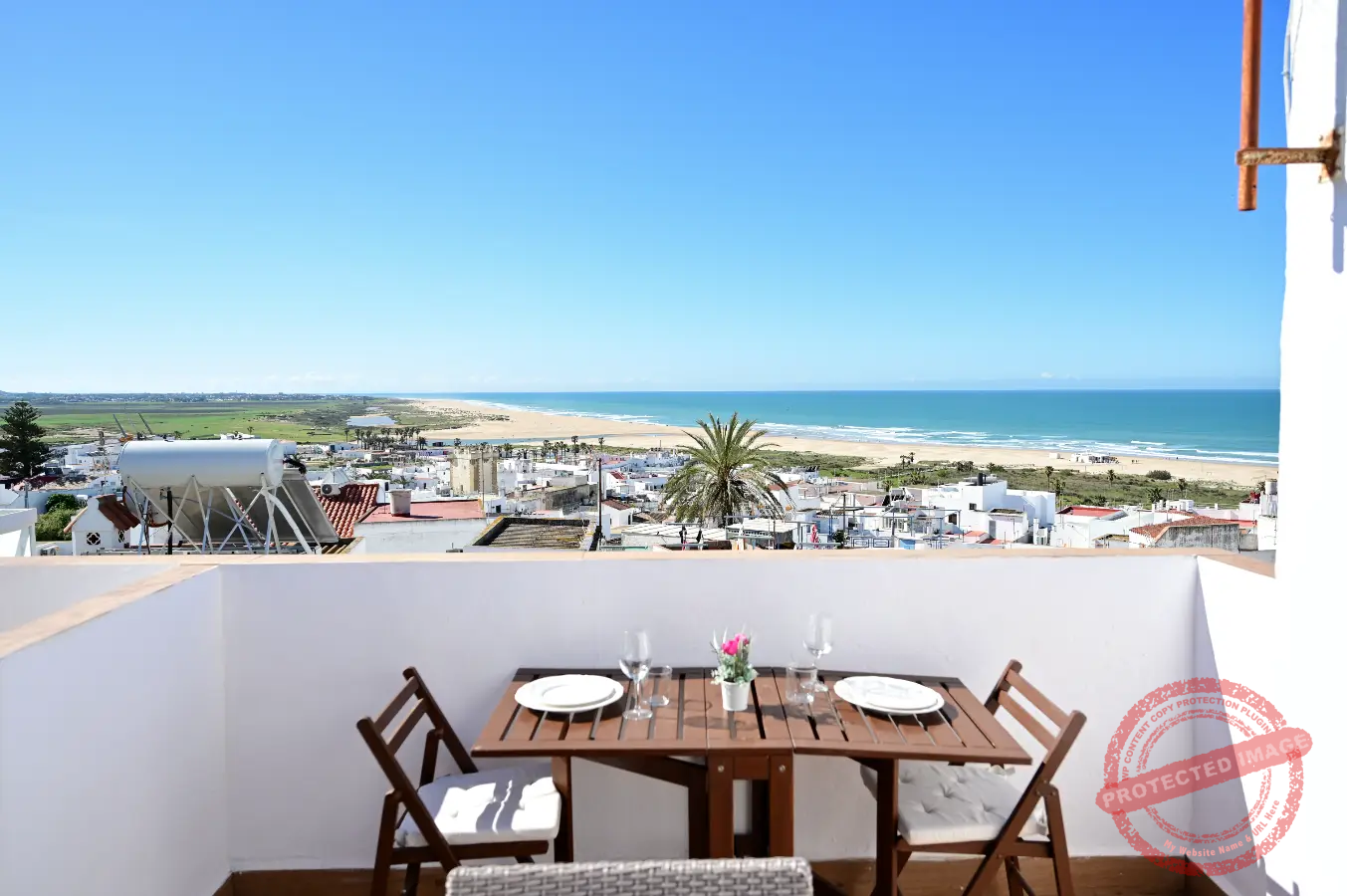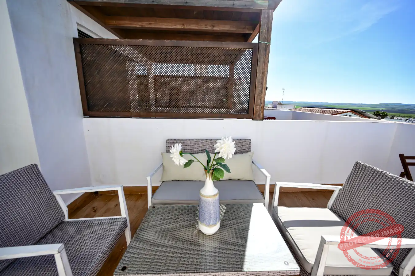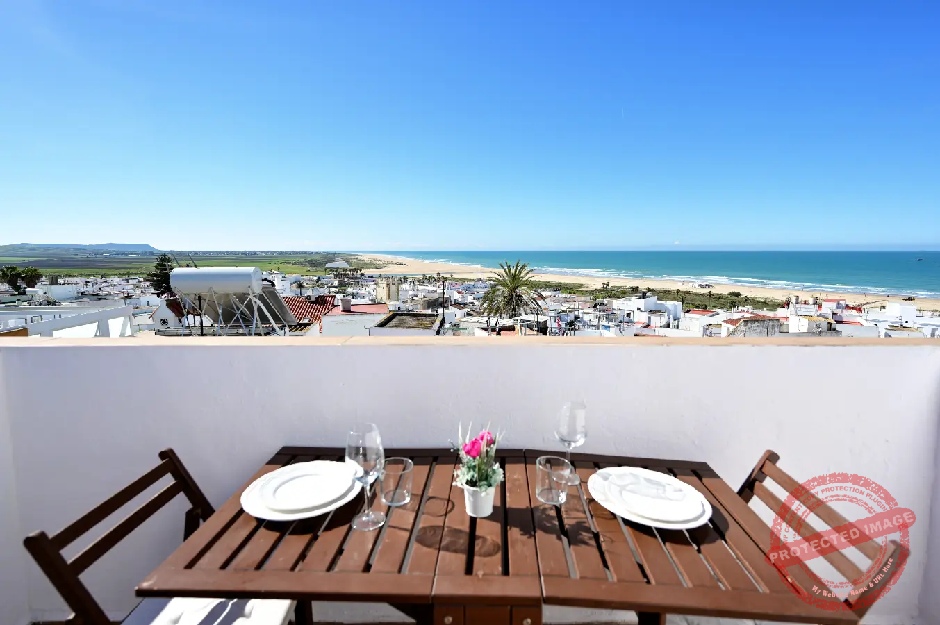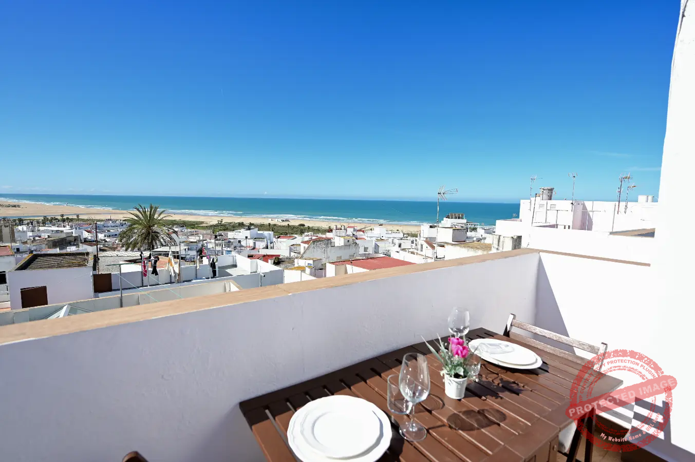 En la parte superior se encuentra una terraza independiente, con mesas y sillas, ideal para comer al aire libre y desde donde se pueden disfrutar vistas al mar. El apartamento cuenta también con balcón, y está adaptado para estancias con niños.