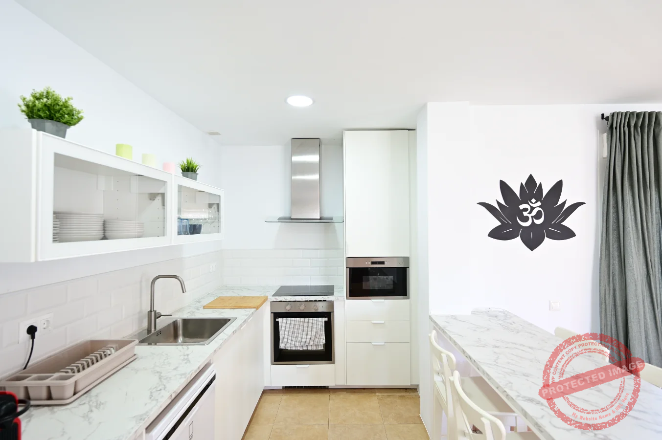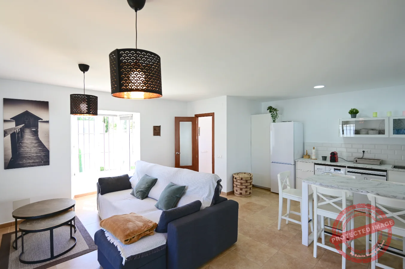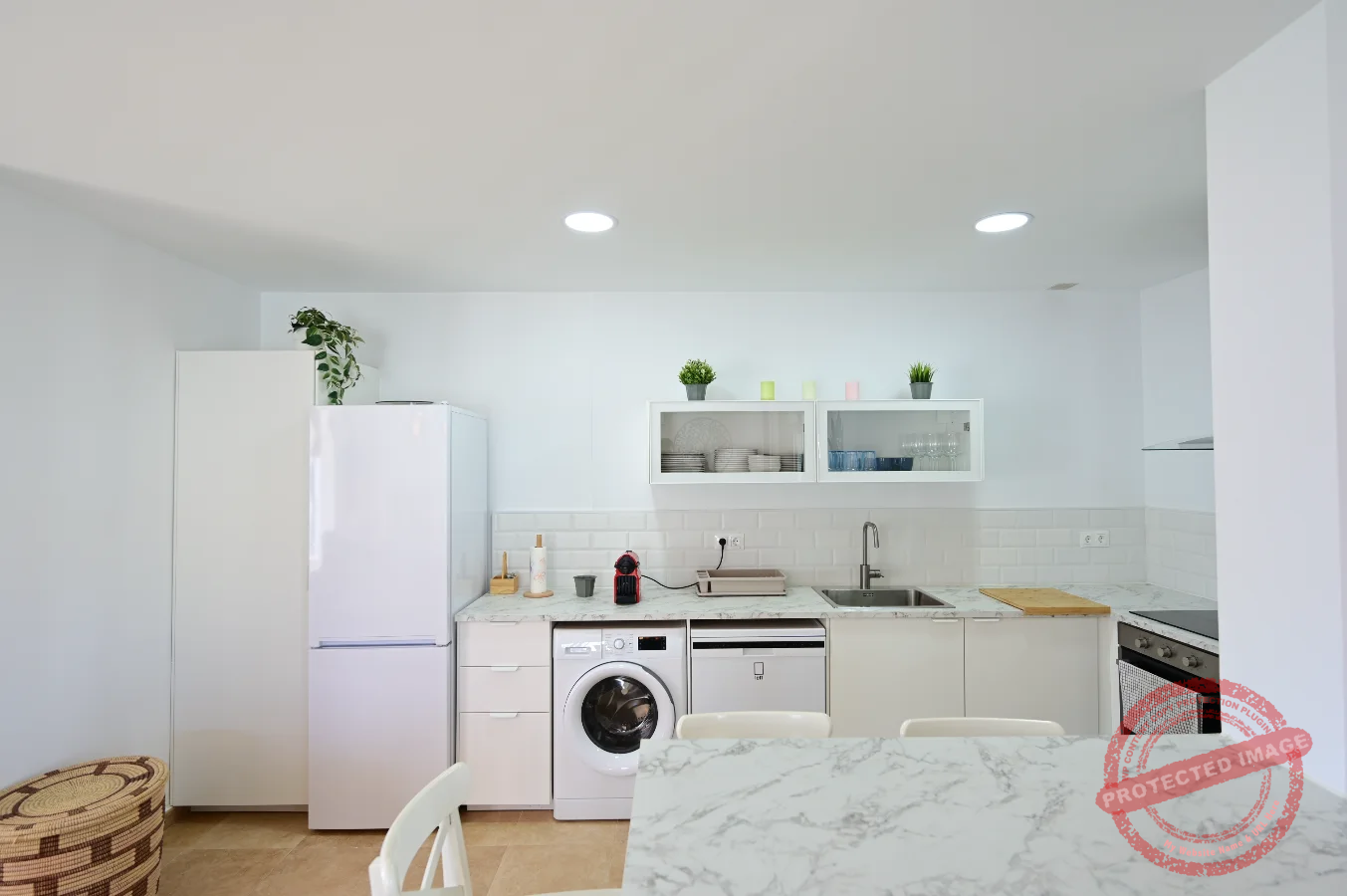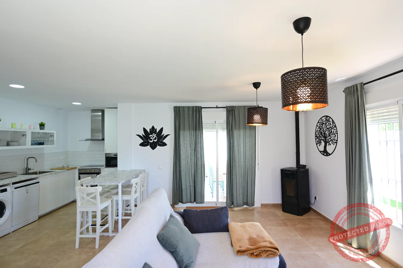 La cocina está completamente equipada, incluyendo horno, microondas, lavavajillas, lavadora, cafetera y otros pequeños electrodomésticos.